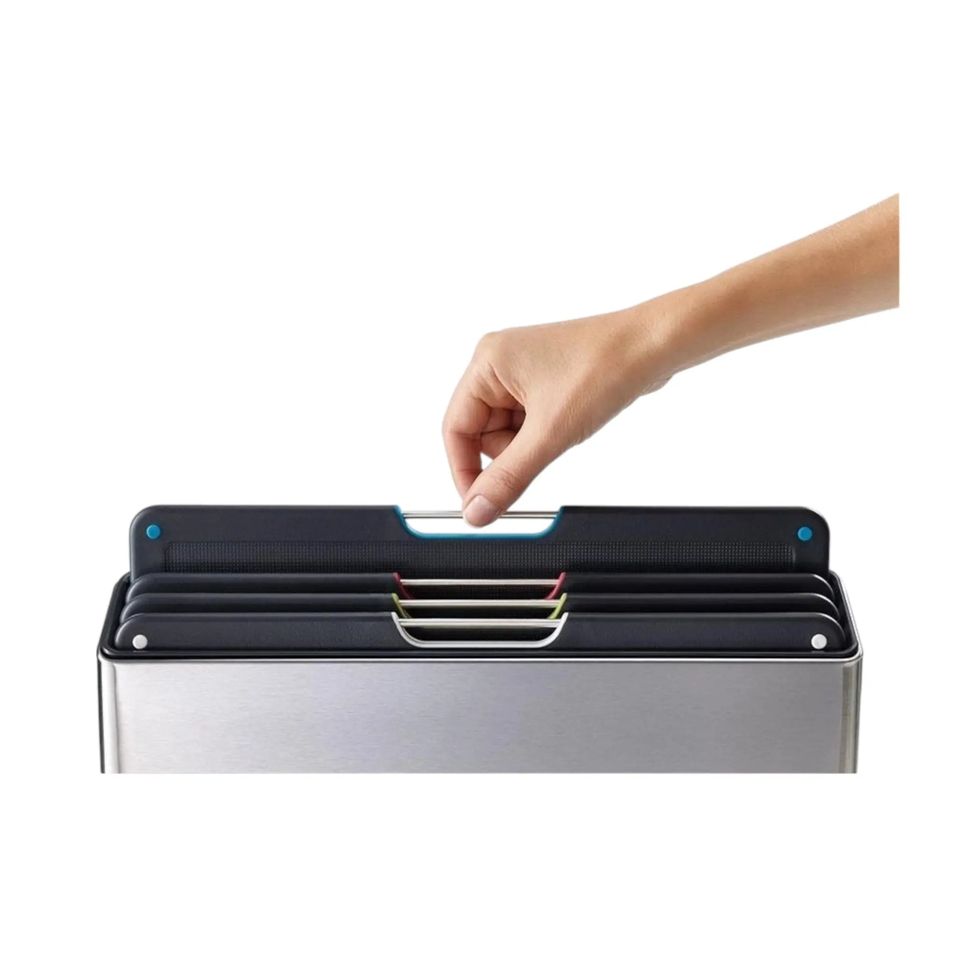 Mit dem 4-teiligen Schneidebrett-Set „Folio“ von Joseph Joseph bringen Sie Ordnung, Hygiene und Stil in Ihre Küche. Jedes Brett verfügt über rutschfeste Füße für sicheres Arbeiten und ist farblich sowie funktional voneinander getrennt – ideal für die getrennte Verarbeitung von Fleisch, Fisch, Gemüse oder Brot. Die kompakte Aufbewahrungsbox aus Edelstahl sorgt für eine stilvolle und hygienische Aufbewahrung.